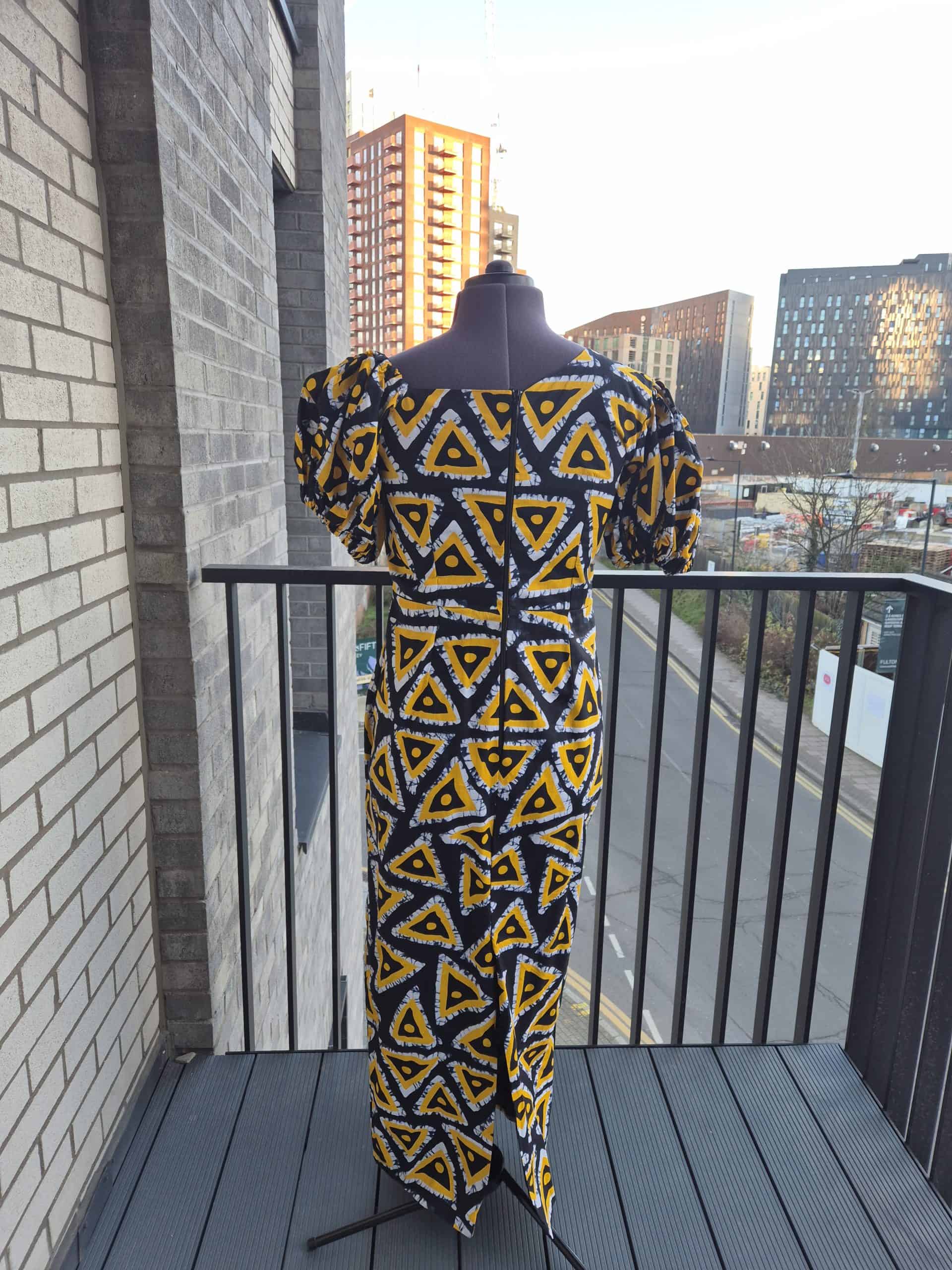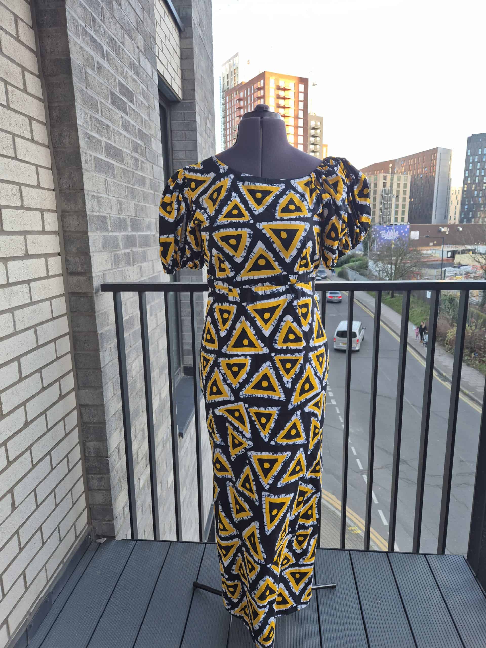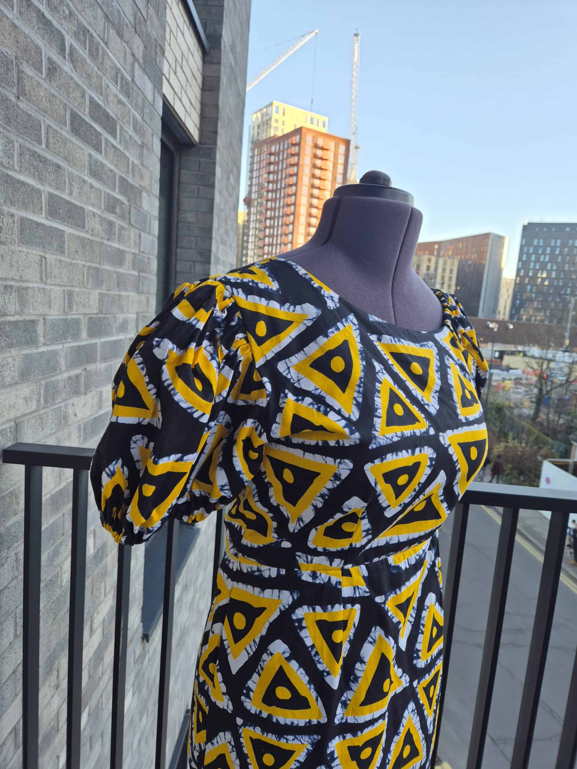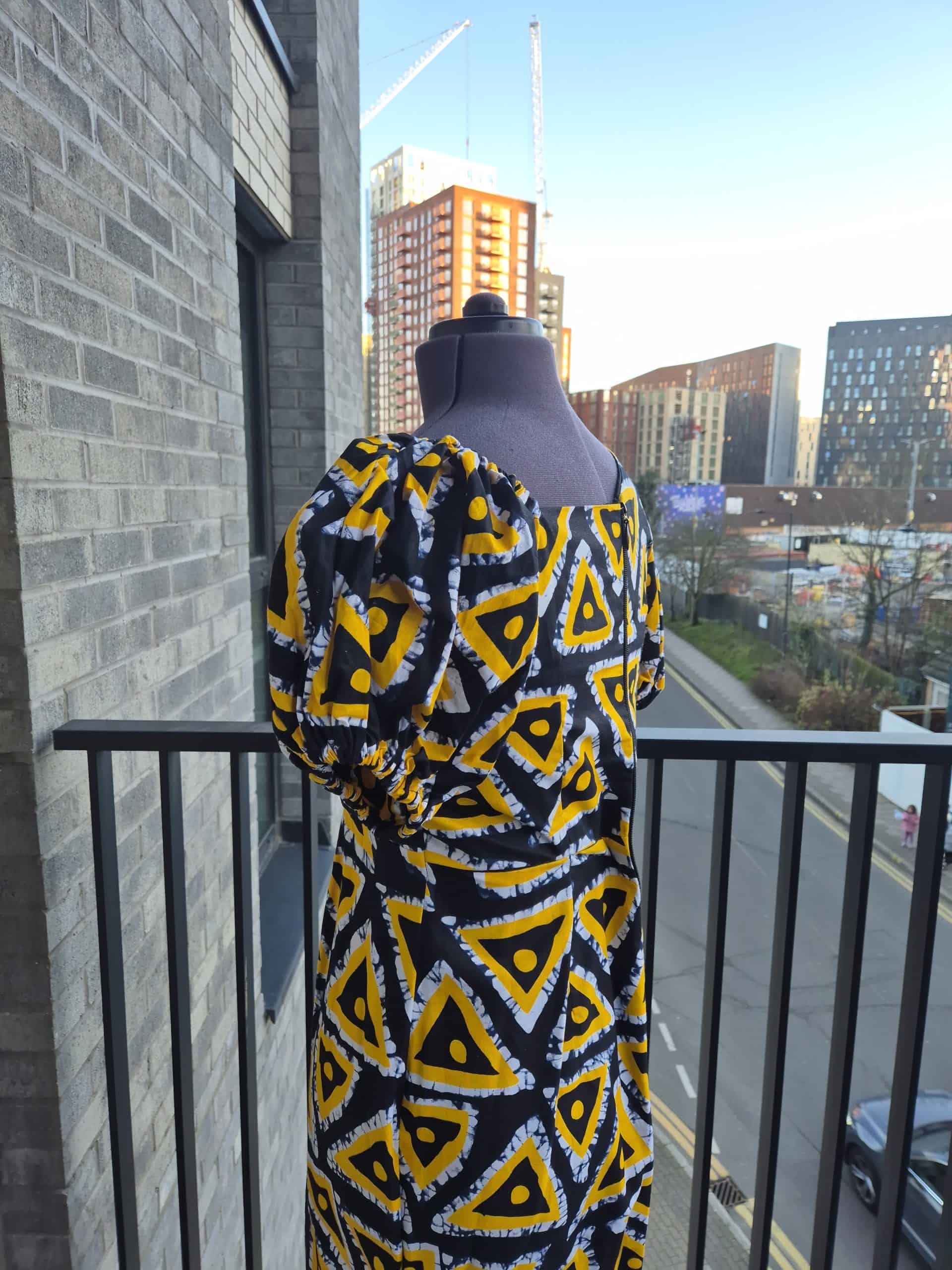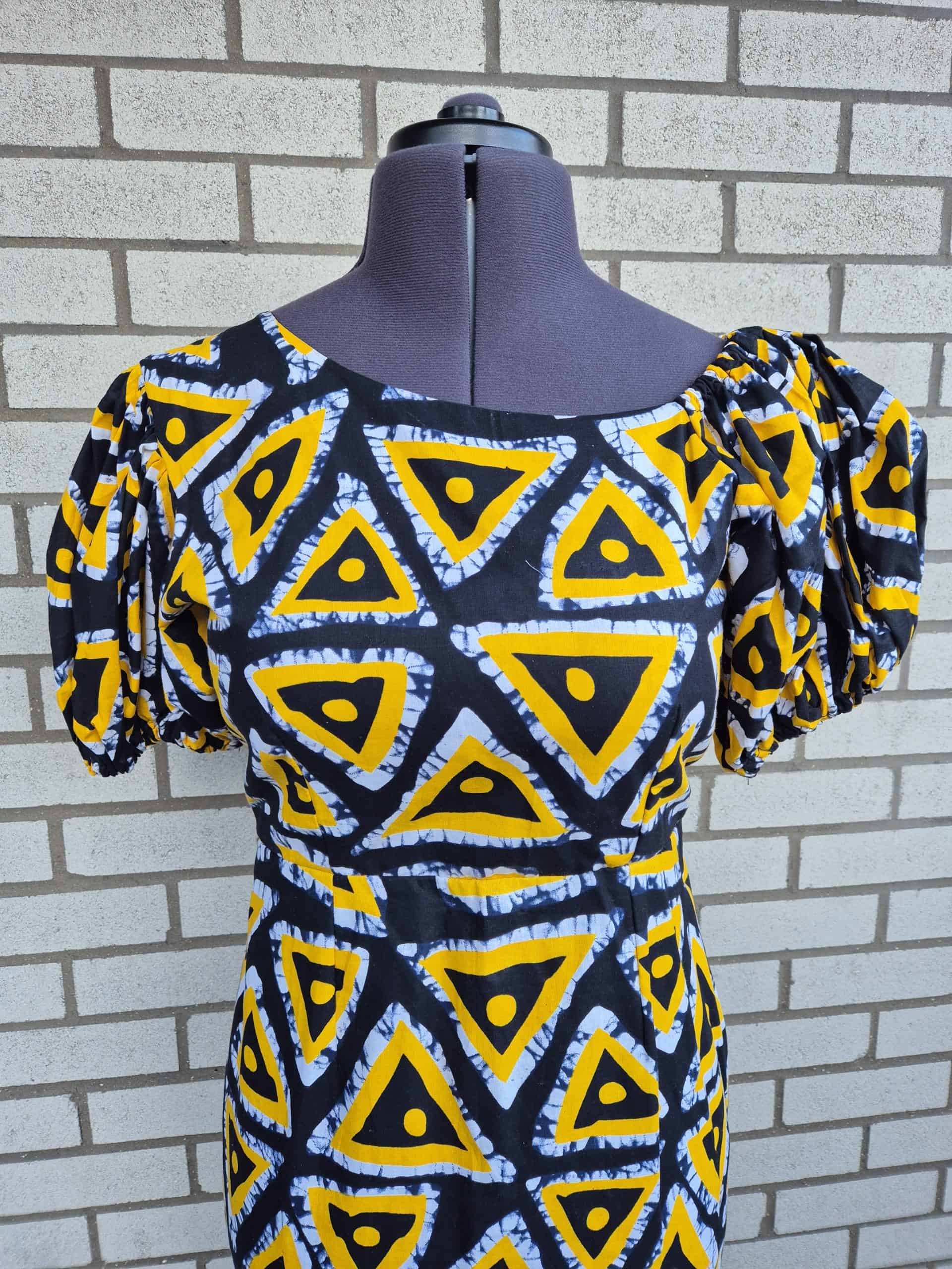 Make a powerful and fashionable statement with this elegant Ankara midi dress. The striking black and yellow geometric pattern creates a modern and eye-catching look, while the classic silhouette ensures timeless appeal. The dress features stylish puff sleeves that add a touch of playful volume and a simple, round neckline. The fitted cut beautifully accentuates the figure, making it suitable for both professional settings and celebratory occasions. Made from high-quality African wax print fabric, this dress is not only a tribute to Nigerian fashion but also a versatile piece for your wardrobe. Pair it with a simple handbag and minimalist jewelry for a polished and chic look.