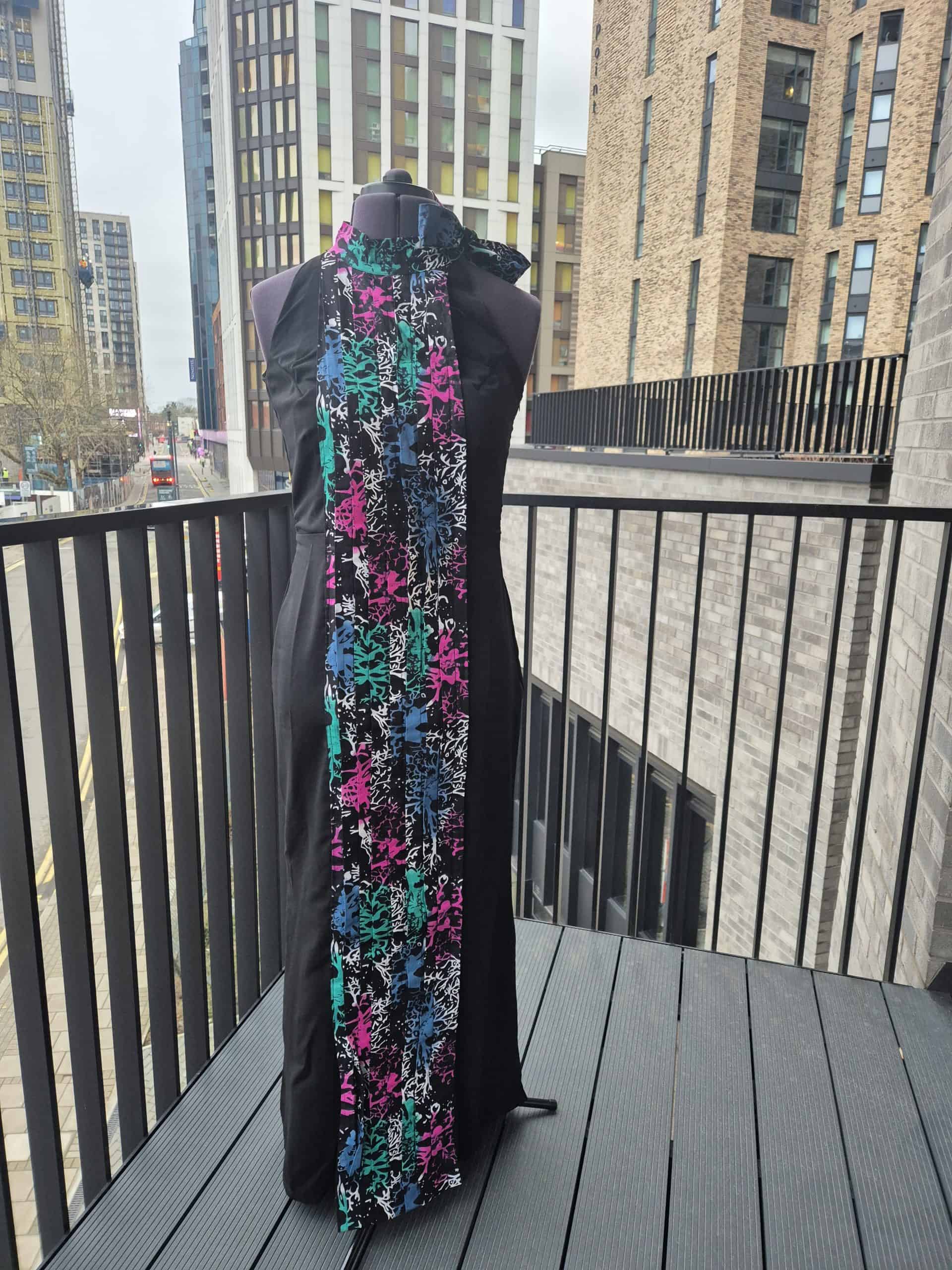Make a powerful and refined statement in this exquisite black halter-neck gown, a perfect blend of modern style and cultural heritage. The dress boasts a sophisticated sleeveless design that beautifully showcases the shoulders, leading to a high neckline. A central, vertical panel of stunning Ankara print in vibrant hues of magenta, turquoise, and lime green creates a captivating focal point, adding a pop of color and unique texture. The dress’s clean, fitted silhouette gracefully follows the body’s natural curves before flaring slightly at the hem, creating a beautiful and elongating line. Ideal for weddings, gala events, or any evening occasion where elegance is key.