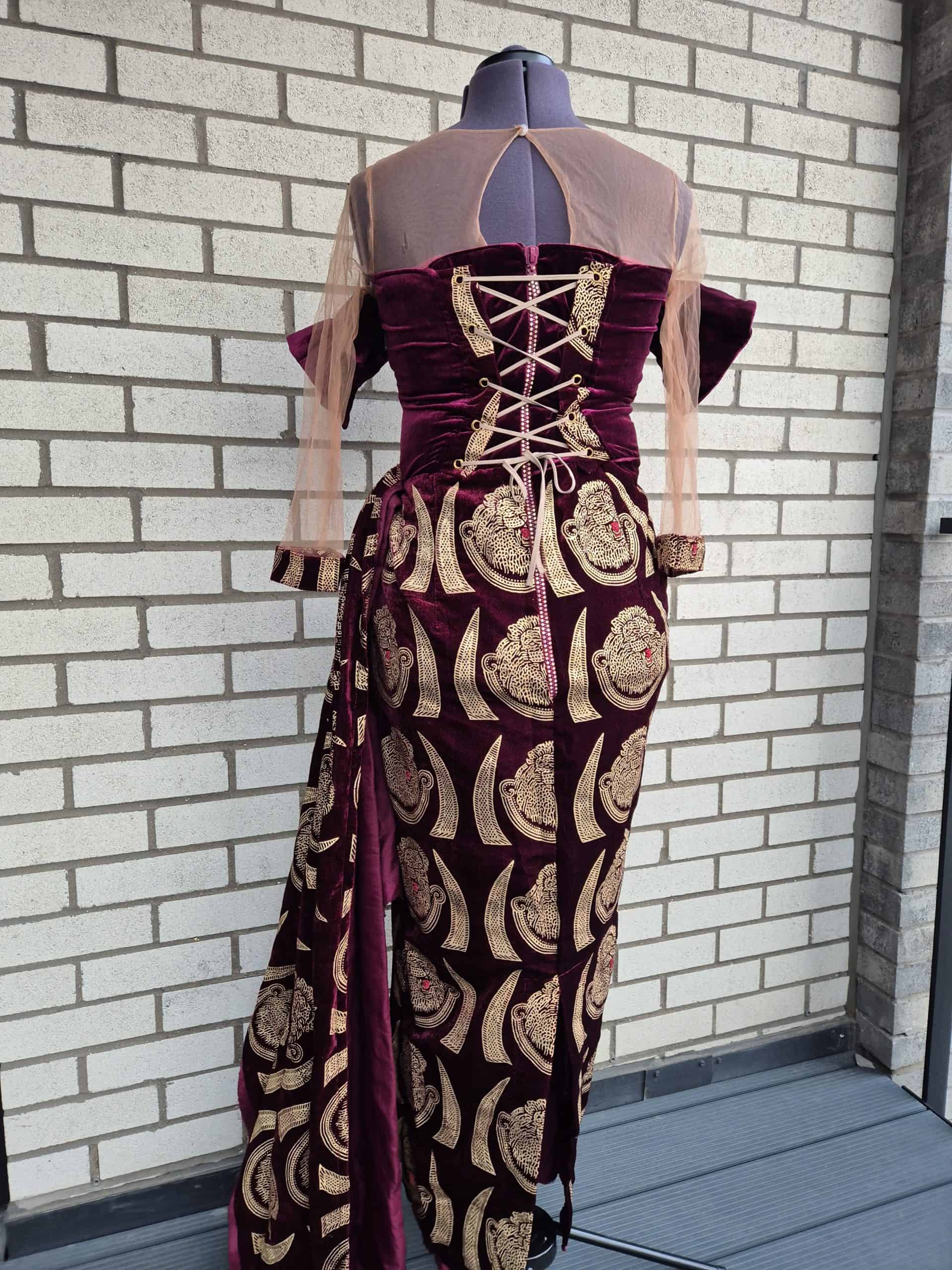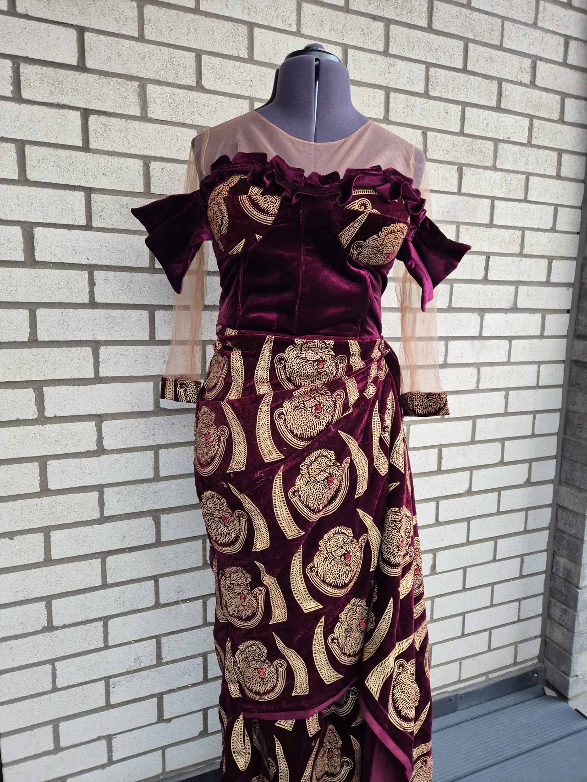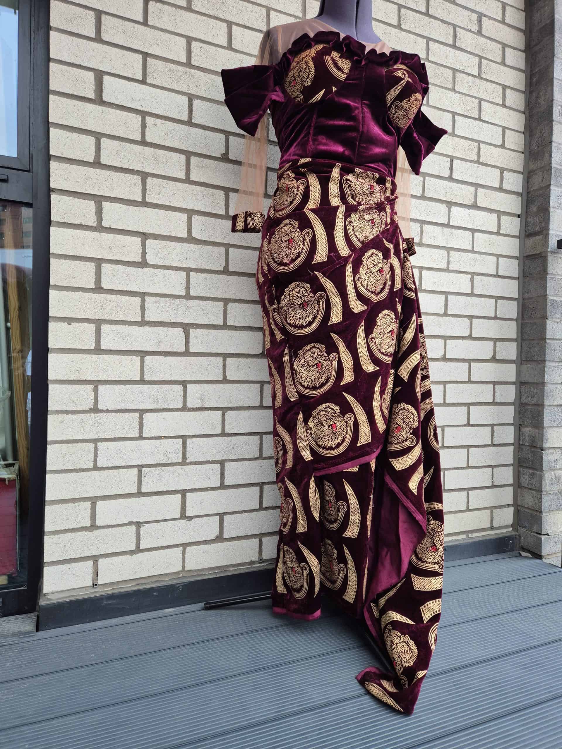 Make a memorable entrance in this luxurious burgundy velvet off-the-shoulder gown, a perfect blend of tradition and contemporary style. The dress features a fitted, corset-style bodice with a flattering neckline that showcases the collarbone, while the delicate mesh sleeves add a touch of sheer elegance. The standout feature is the vibrant gold, traditional-inspired embroidery that covers the entire gown, creating a beautiful contrast against the deep red velvet. A high-slit, wrap-style skirt adds movement and a modern edge, making this a perfect choice for weddings, formal dinners, and cultural celebrations where you want to make a statement. Paired with coral beads, this gown embodies sophisticated Nigerian and African fashion.