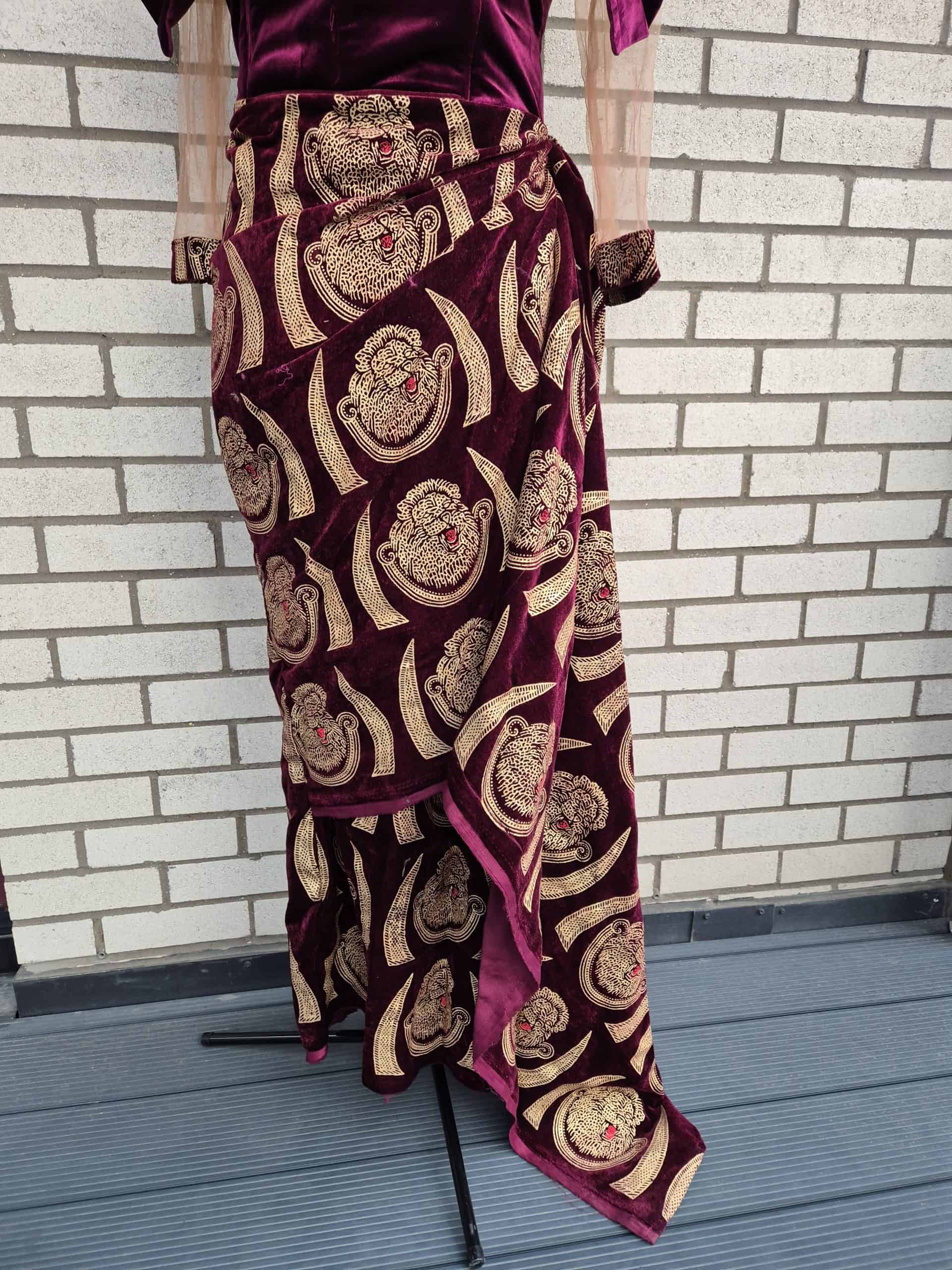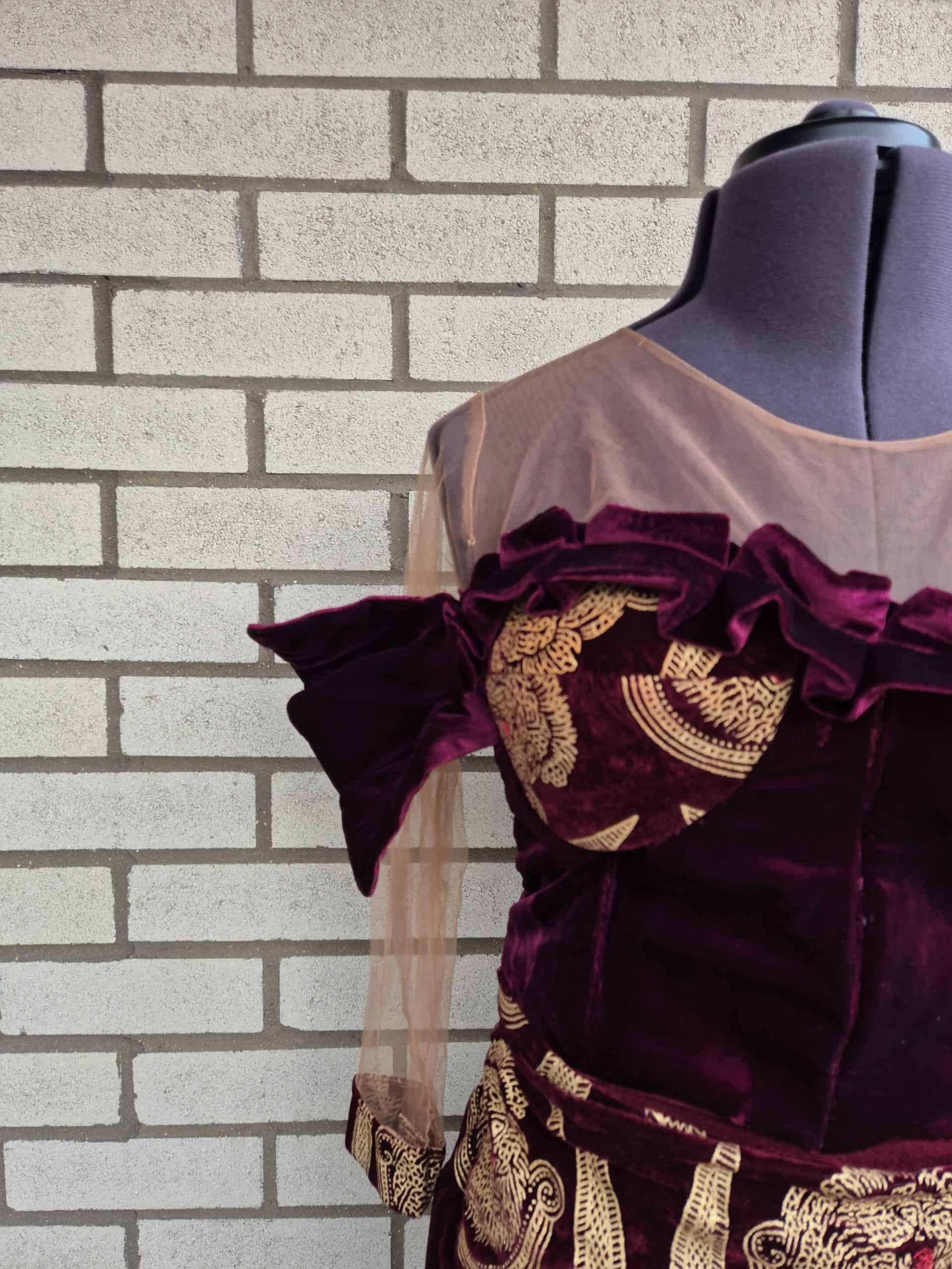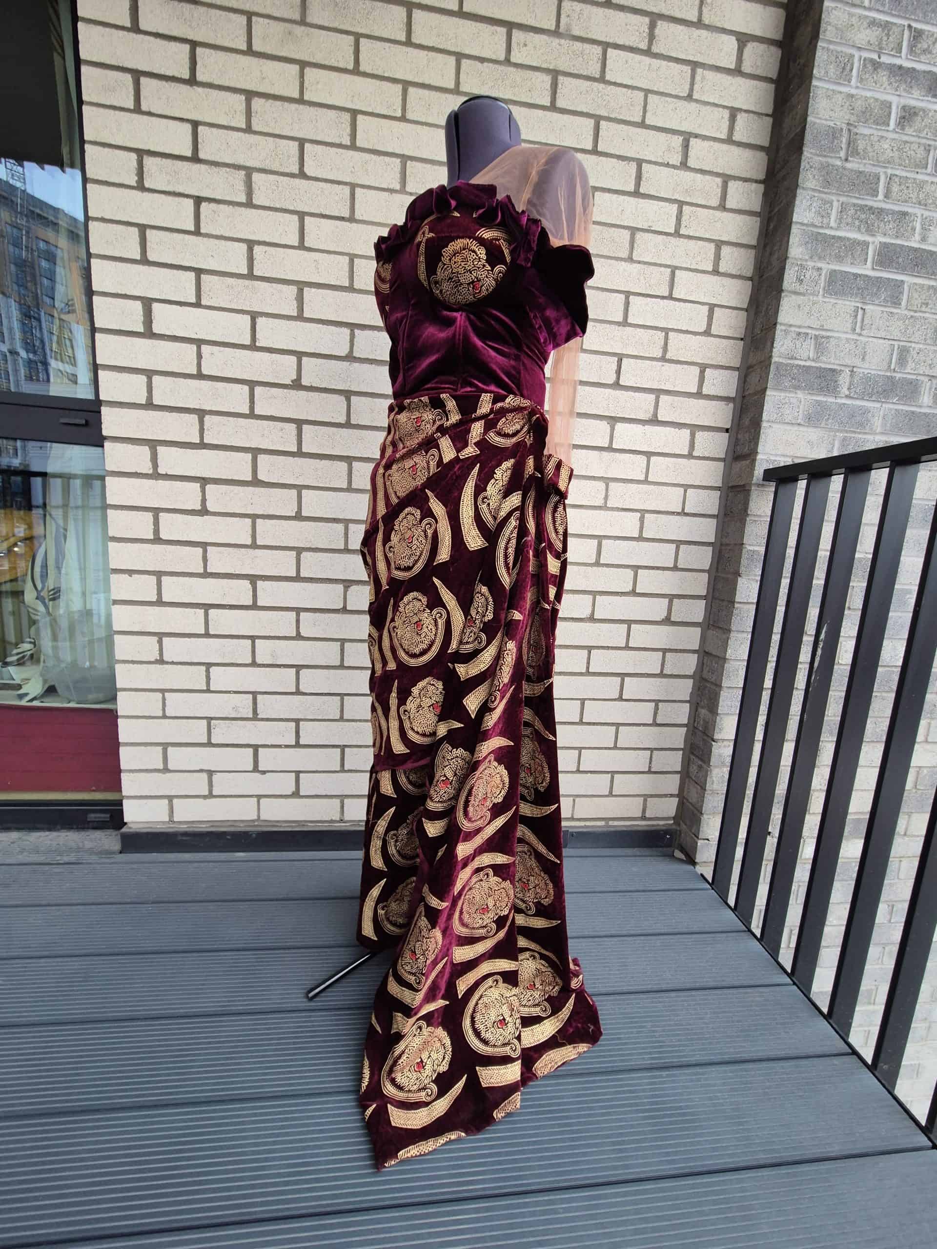 Make a memorable entrance in this luxurious burgundy velvet off-the-shoulder gown, a perfect blend of tradition and contemporary style. The dress features a fitted, corset-style bodice with a flattering neckline that showcases the collarbone, while the delicate mesh sleeves add a touch of sheer elegance. The standout feature is the vibrant gold, traditional-inspired embroidery that covers the entire gown, creating a beautiful contrast against the deep red velvet. A high-slit, wrap-style skirt adds movement and a modern edge, making this a perfect choice for weddings, formal dinners, and cultural celebrations where you want to make a statement. Paired with coral beads, this gown embodies sophisticated Nigerian and African fashion.