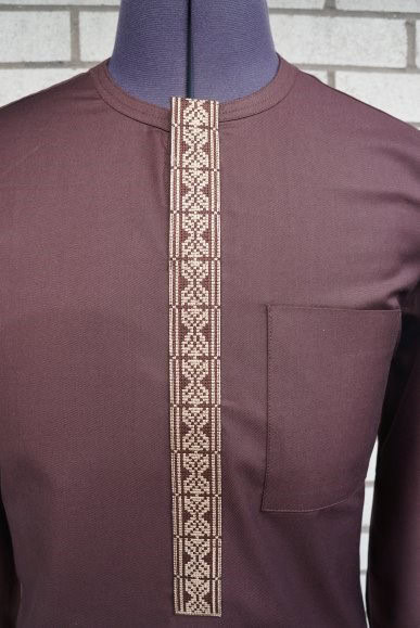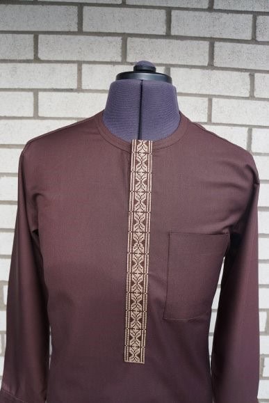 Command attention and exude confidence with the Kaftan Set, a perfect blend of timeless style and modern elegance. This two-piece ensemble is meticulously crafted in a rich, chocolate brown, a color that speaks of earthiness and sophistication. The long-sleeve top, featuring a classic mandarin collar, is elevated by a striking vertical panel of intricate gold and white geometric embroidery that runs down the chest. This detailed pattern adds a luxurious touch and a sense of cultural heritage to the otherwise minimalist design. Paired with perfectly matched trousers, this set offers a comfortable and tailored fit, making it an ideal choice for formal events, evening parties, or any occasion where you want to make a powerful fashion statement. The set is more than an outfit; it’s a statement of class and refined taste.