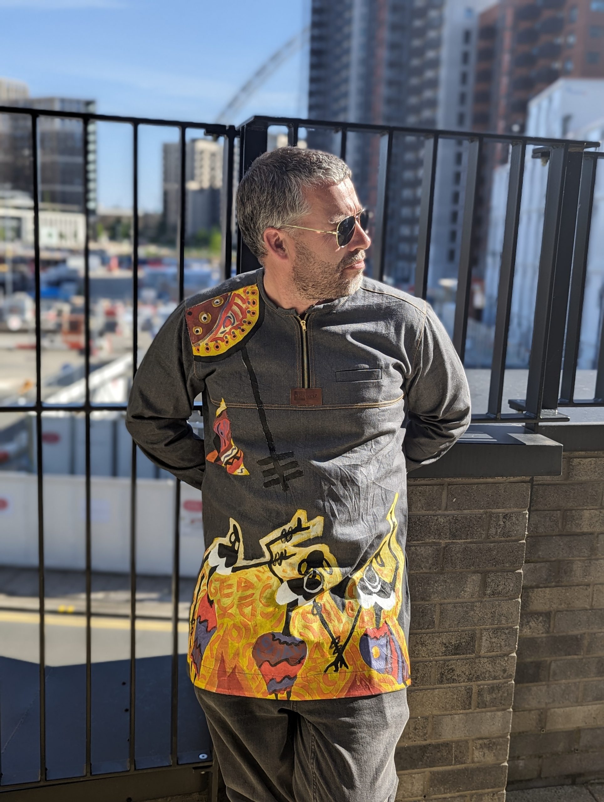 This exclusive hand-painted denim kaftan from Roweiz is a canvas of captivating tribal art. The garment features a bold, hand-painted design of stylized human figures in motion, set against a backdrop of vibrant, abstract patterns. The unique artistry extends to the shoulder and sleeve, where colorful, symbolic motifs are meticulously painted. Crafted from high-quality gray denim, this shirt offers a comfortable fit while celebrating rich cultural traditions through a modern lens. This is the perfect garment for those who appreciate unique fashion and want to wear a piece of art that tells a story