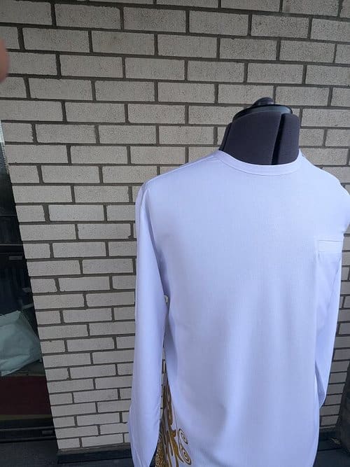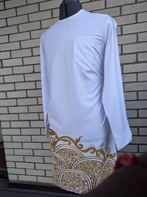 Premium Fabric: Made from a premium, bright white fabric with a slight sheen that allows the detailed metallic gold embroidery to truly stand out.